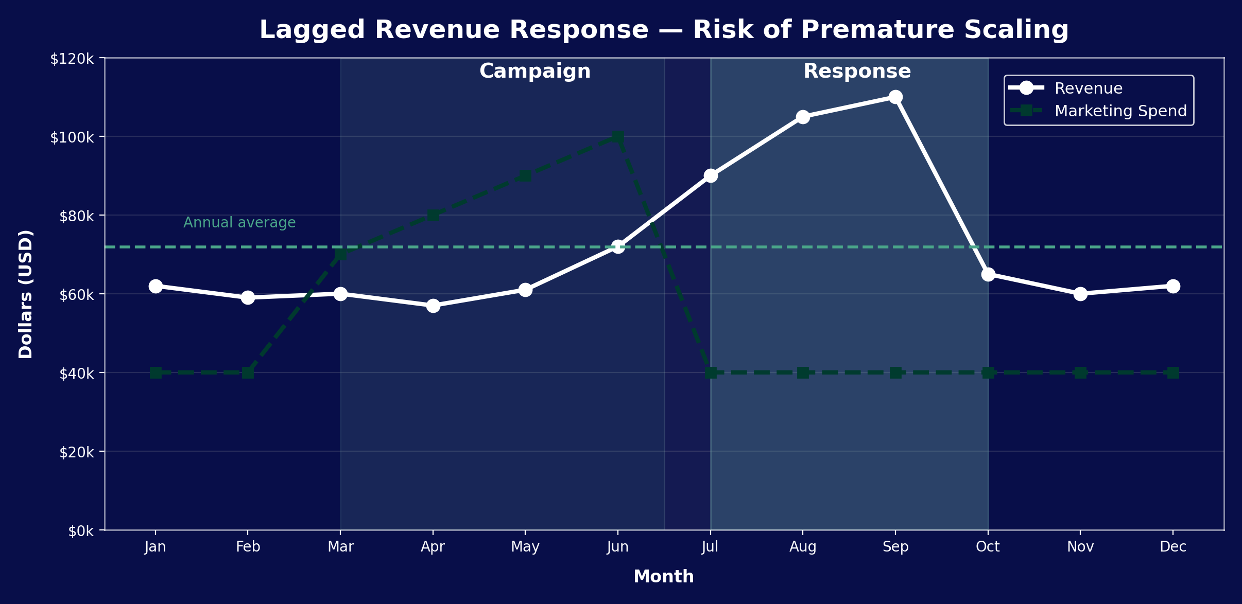 Revenue may respond only after awareness builds, budgets cycle, or customers reach purchase readiness. Evaluating performance within short reporting windows can misclassify effective actions as failures and encourage premature changes.