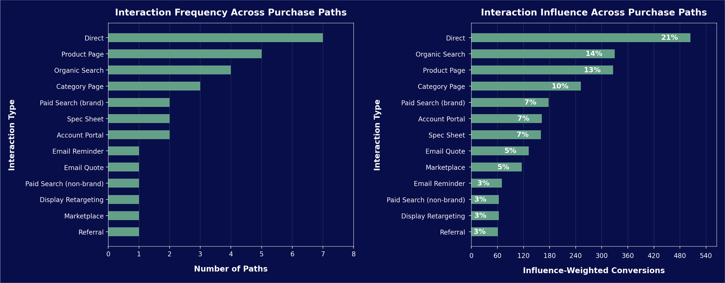 Caption: The left panel (Interaction Frequency) informs the question: “Which channels frequently appear in journeys?” The right panel (Interaction Influence) informs the question: ““Do longer journeys convert more?”