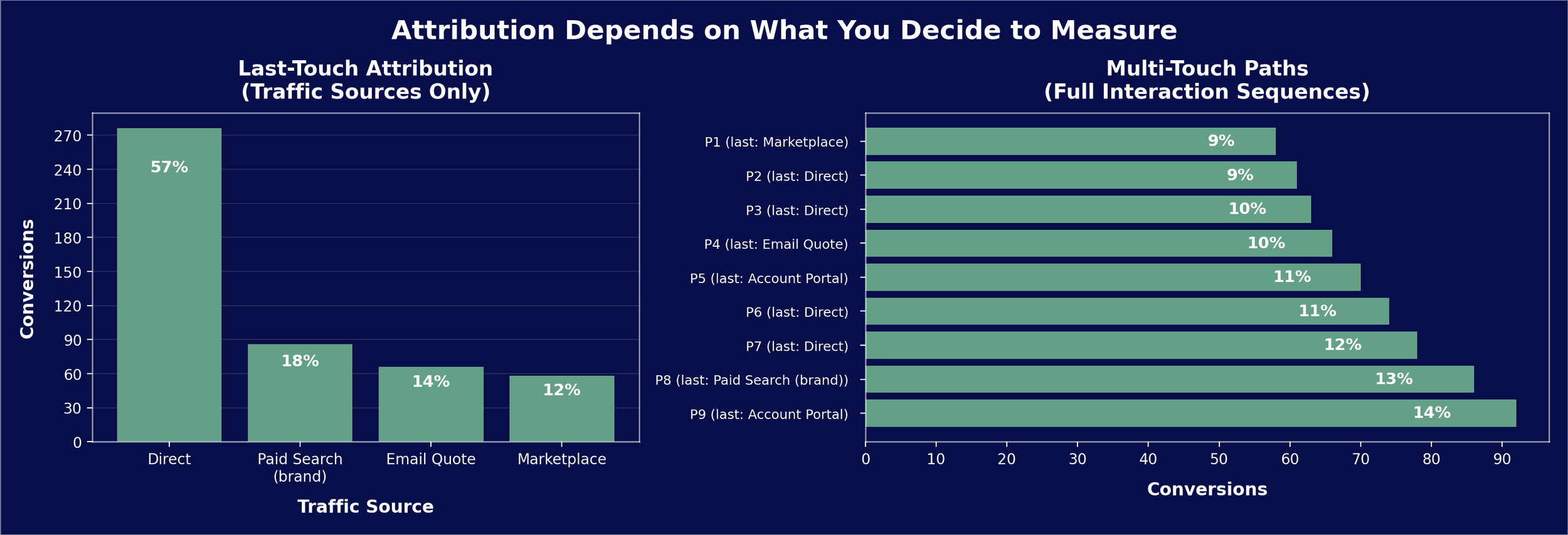 Caption. Channel-level reporting emphasized final interaction points, creating the impression that channels operated independently. Path analysis revealed that most conversions involved multiple touchpoints, often spanning weeks or months. Treating the last interaction as the primary driver obscured how channels reinforced one another over time.
